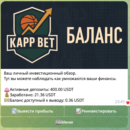 KappBet — инвестиционный проект от опытной команды админов и доходностью от 1 до 2.5% в сутки. Работает на боте Telegram. Категория проекта: [индивидуальный листинг].