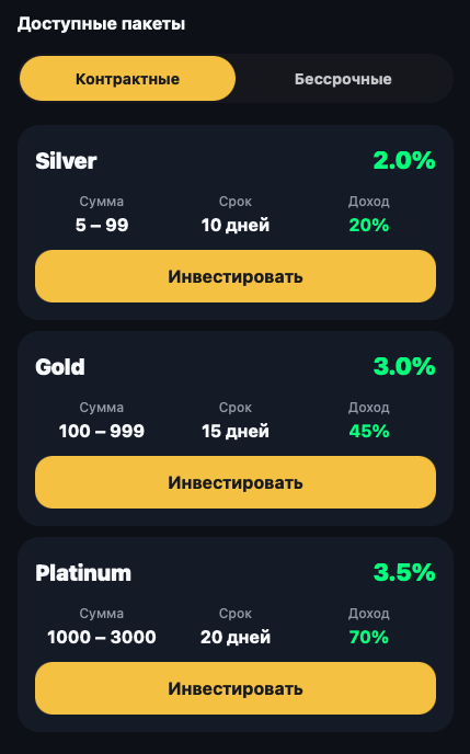 - Сколько можно заработать? Например, инвестировали 100$ на 10 дней, заработали от 20$ чистой прибыли с проекта + мой RCB 5$.